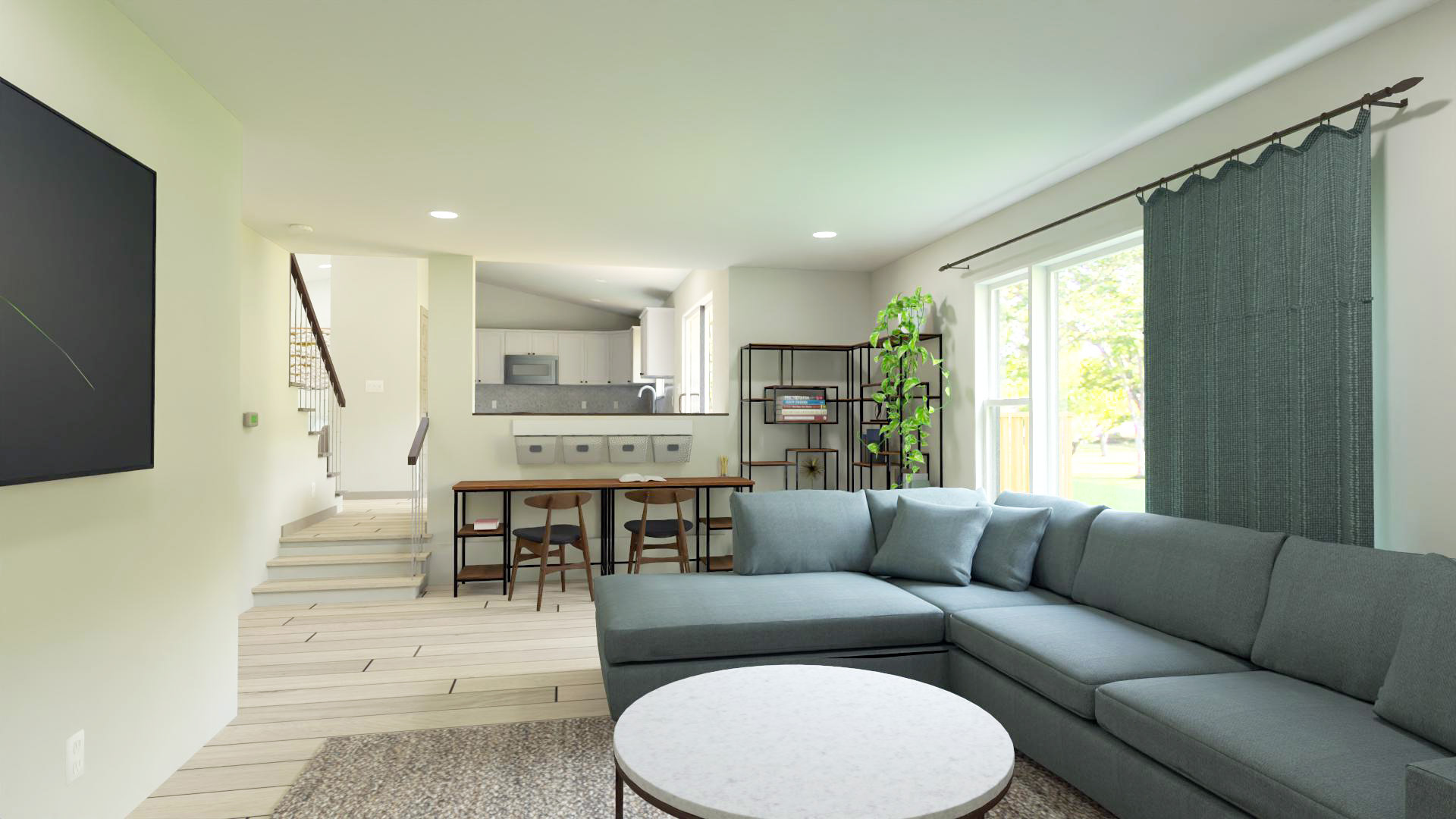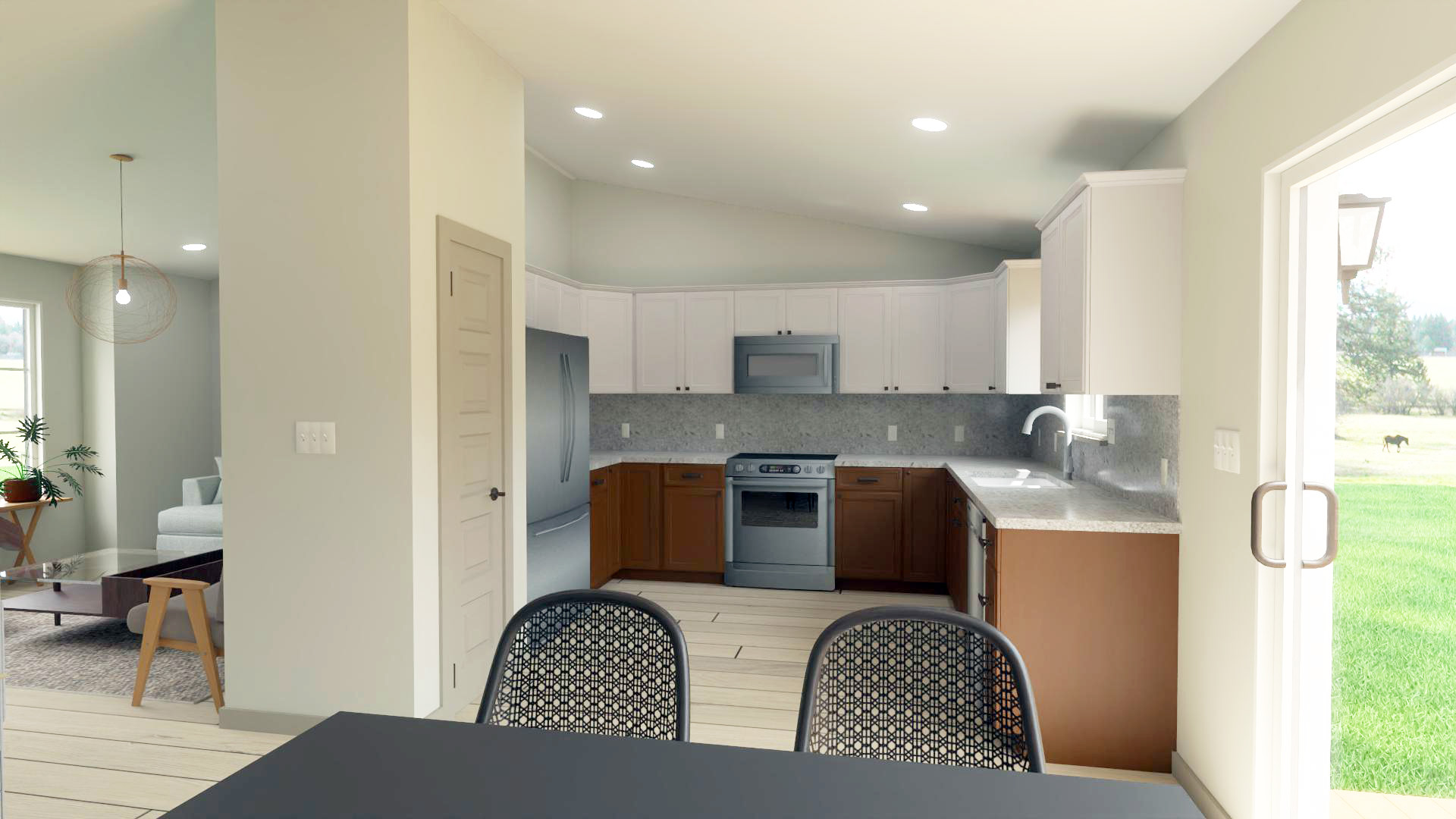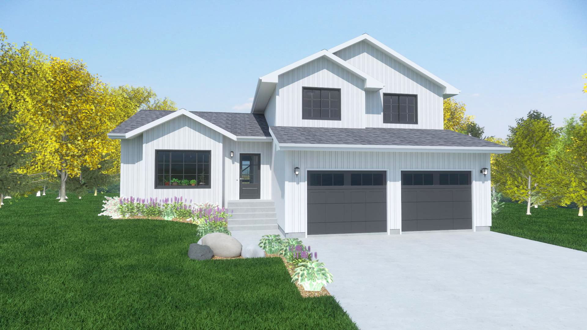 This exciting tri-level design has all the features of a large home, but fits on a small lot. The front living room and kitchen are complete with vaulted ceilings to enhance the space. All of the spaces have a degree of separation, while still being open to each other.