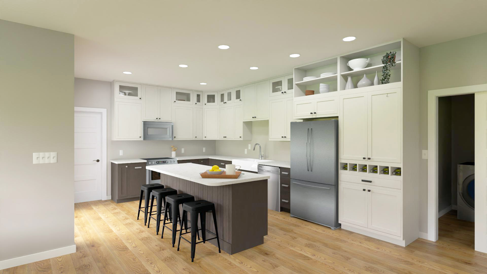 The Manchester Plus has more square footage than the Manchester, which creates a larger kitchen area creating all kinds of possibilities. Want a large walk in pantry or just lots of cabinets? It is easily possible with the Manchester Plus.